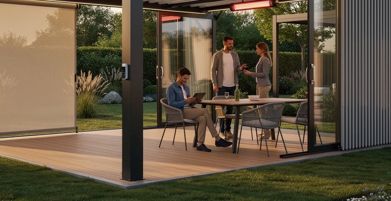 Côté chauffage, les panneaux radiants infrarouges s’imposent comme la solution la plus adaptée. Fixés en hauteur sur les traverses, ils chauffent directement les corps et les objets plutôt que l’air, ce qui est particulièrement efficace en espace semi-ouvert. Puissants mais compacts, ils se pilotent souvent par gradation (50 %, 75 %, 100 %) pour ajuster le confort sans surconsommer. Combinés à des fermetures vitrées ou à des stores ZIP, ils permettent de gagner plusieurs mois d’utilisation confortable par an, rendant votre investissement dans une pergola bioclimatique encore plus rentable.